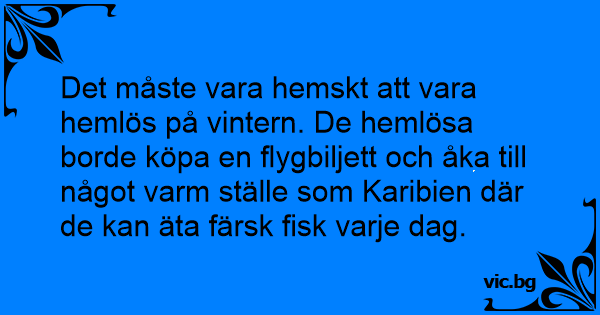 Det måste vara hemskt att vara hemlös på vintern. De hemlösa borde köpa en flygbiljett och åka till något varm ställe som Karibien där de kan äta färsk fisk varje dag.