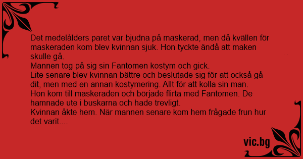 Mannen svarade att det var en trist maskerad och att han suttit och spelat kort hela kvällen, men tillade att killen som lånat Fantomen kostymen hade haft väldigt trevligt...