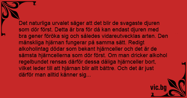 Det naturliga urvalet säger att det blir de svagaste djuren som dör först. Detta är вrа för då kan endast djuren med вrа gener föröka sig och således vidareutvecklas arten. Den mänskliga hjärnan fungerar på samma sätt. Redigt alkoholintag dödar som bekant hjärnceller och det är de sämsta hjärncellerna som dör först. Om man dricker alkohol regelbundet rensas därför dessa dåliga hjärnceller bort, vilket leder till att hjärnan blir allt bättre. Och det är just därför man alltid känner sig smartare efter några öl!
