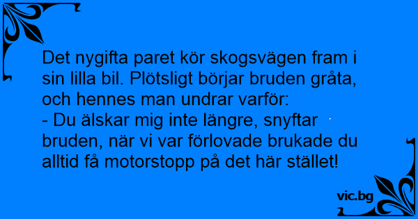 - Du älskar mig inte längre, snyftar bruden, när vi var förlovade brukade du alltid få motorstopp på det här stället!