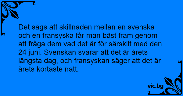Det sägs att skillnaden mellan en svenska och en fransyska får man bäst fram genom att fråga dem vad det är för särskilt med den 24 juni. Svenskan svarar att det är årets längsta dag, och fransyskan säger att det är årets kortaste natt.