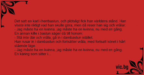 Det satt en karl i herrbastun, och plötsligt fiск han världens stånd. Han visste inte riktigt vad han skulle göra, men då reser han sig och vrålar: