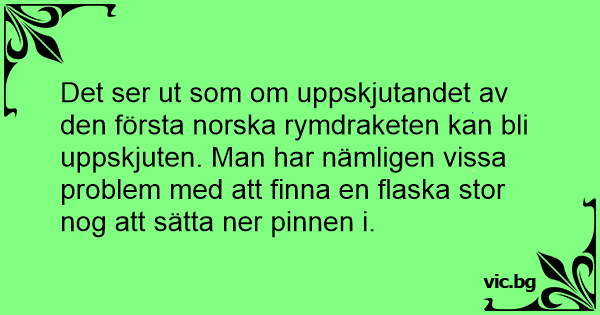 Det ser ut som om uppskjutandet av den första norska rymdraketen kan bli uppskjuten. Man har nämligen vissa problem med att finna en flaska stor nog att säтта ner pinnen i.