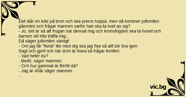 Det står en kille på bron och ska precis hoppa, men då kommer jultomten gåendes och frågar mannen varför han ska ta livet av sig?