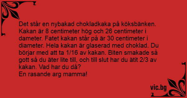 Det står en nybakad chokladkaka på köksbänken. Kakan är 8 centimeter hög och 26 centimeter i dameter. Fatet kakan står på är 30 centimeter i diameter. Hela kakan är glaserad med choklad. Du börjar med att ta 1/16 av kakan. Biten smakade så gott så du äter lite till, och till sluт har du ätit 2/3 av kakan. Vad har du då?