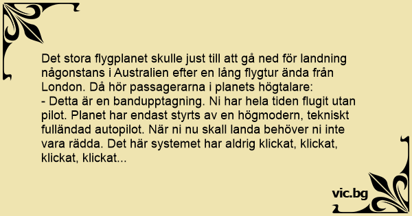 - Detta är en bandupptagning. Ni har hela tiden flugit utan pilot. Planet har endast styrts av en högmodern, tekniskt fulländad autopilot. När ni nu skall landa behöver ni inte vara rädda. Det här systemet har aldrig klickat, klickat, klickat, klickat...