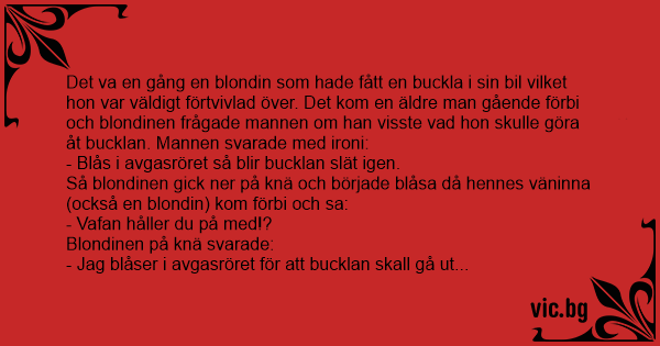 En blondin hade fått en buckla på bilen, och en man som gick förbi ville skoja med henne: - Ställ dig på alla fyra och blås i avgasröret så ska du se att den ploppar ut igen. Sagt å gjort, hon...