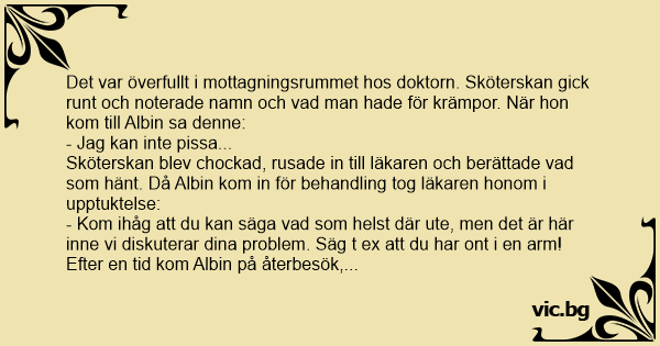 Det var överfullt i mottagningsrummet hos doktorn. Sköterskan gick runt och noterade namn och vad man hade för krämpor. När hon kom till Albin sa denne: