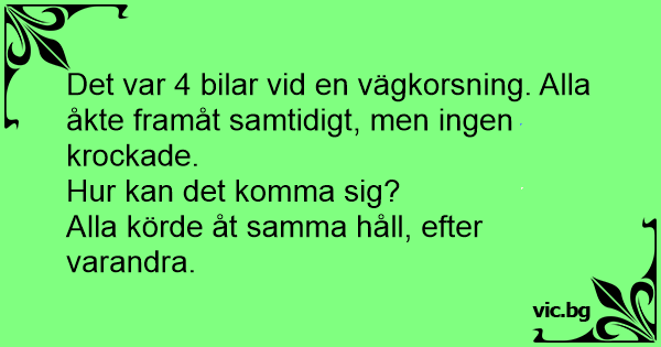 Det var 4 bilar vid en vägkorsning. Alla åkte framåt samtidigt, men ingen krockade.