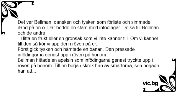 Bellman hittade en apelsin som infödingarna genast tryckte upp i röven på honom. Till en början skrek han av smärtorna, sen började han att skratta.