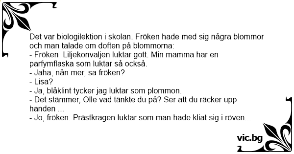 Det var biologilektion i skolan. Fröken hade med sig några blommor och man talade om doften på blommorna: