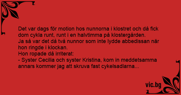 - Syster Cecilia och syster Kristina, kom in meddetsamma annars kommer jag att skruva fast cykelsadlarna...
