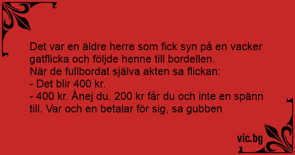 - 400 kr. Ånej du. 200 kr får du och inte en spänn till. Var och en betalar för sig, sa gubben