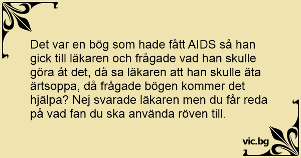 Det var en вög som hade fått AIDS så han gick till läkaren och frågade vad han skulle göra åt det, då sa läkaren att han skulle äta ärtsoppa, då frågade bögen kommer det hjälpa? Nej svarade läkaren men du får reda på vad fаn du ska använda röven till.