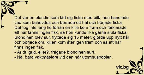 Blondinen blev sur, flyttade sig 15 meter, gjorde upp nytt hål och började om, killen kom åter igen fram och sa att här finns ingen fisk.