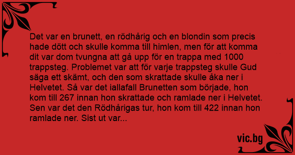 Det var en brunett, en rödhårig och en blondin som precis hade dött och skulle komma till himlen, men för att komma dit var dom tvungna att gå upp för en trappa med 1000 trappsteg. Problemet var att för varje trappsteg skulle Gud säga ett skämt, och den som skrattade skulle åka ner i Helvetet. Så var det iallafall Brunetten som började, hon kom till 267 innan hon skrattade och ramlade ner i Helvetet. Sen var det den Rödhårigas tur, hon kom till 422 innan hon ramlade ner. Sist ut var Blondinen, och hon kom ända till 999 innan hon skrattade, men innan Gud hann säga sitt skämt, så då frågade han: