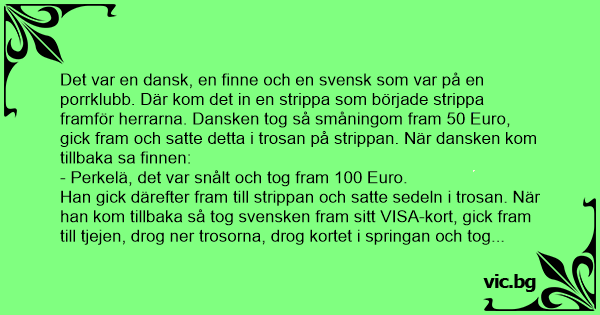 Det var en dansk, en finne och en svensk som var på en porrklubb. Där kom det in en strippa som började strippa framför herrarna. Dansken tog så småningom fram 50 Euro, gick fram och satte detta i trosan på strippan. När dansken kom tillbaka sa finnen: