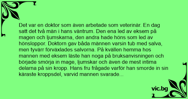 Det var en doktor som även arbetade som veterinär. En dag satt det två män i hans väntrum. Den ena led av eksem på magen och ljumskarna, den andra hade höns som led av hönsloppor. Doktorn gav båda männen varsin tub med salva, men tyvärr förväxlades salvorna. På kvällen hemma hos mannen med eksem läste han noga på bruksanvisningen och började smörja in mage, ljumskar och även de mest intima delarna på sin kropp. Hans fru frågade varför han smorde in sin käraste kroppsdel, varvid mannen svarade att det ju stod på tuben att man även skulle smörja in pinnen som hönan ska sitta på.....