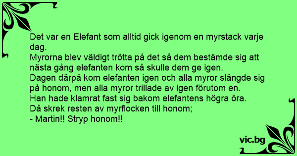 Det var en Elefant som alltid gick igenom en myrstack varje dag.