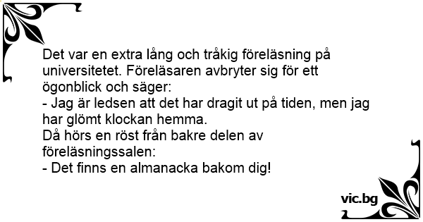 Det var en extra lång och tråkig föreläsning på universitetet. Föreläsaren avbryter sig för ett ögonblick och säger: