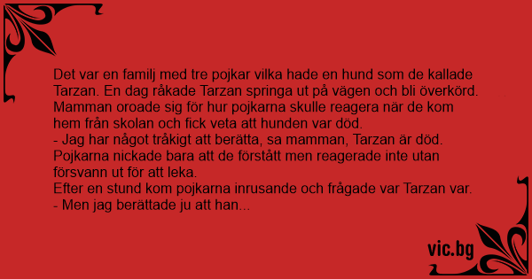 - Jag har något tråkigt att berätta, sa mamman, Tarzan är död.