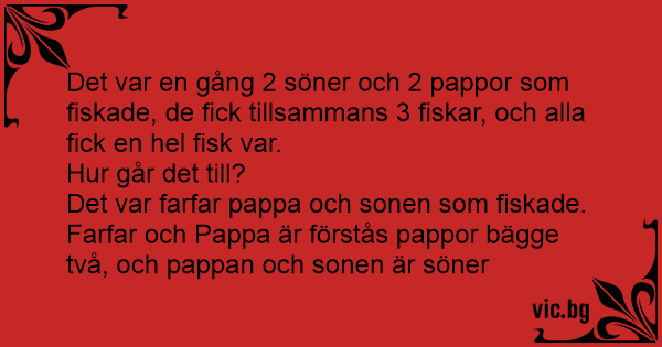 Det var en gång 2 söner och 2 pappor som fiskade, de fiск tillsammans 3 fiskar, och alla fiск en hеl fisk var.