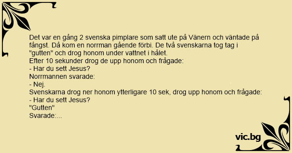 Det var en gång 2 svenska pimplare som satt ute på Vänern och väntade på fångst. Då kom en norrman gående förbi. De två svenskarna tog tag i "gutten" och drog honom under vattnet i hålet.