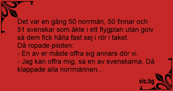 Det var en gång 50 norrmän, 50 finnar och 51 svenskar som åkte i ett flygplan utan golv så dem fiск hålla fast sej i rör i taket.