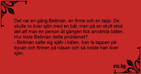 Det var en gång Bellman, en finne och en lapp. De skulle ro över sjön med en båt, men på en skylt stod det att max en person åt gången fiск använda båten. Hur löste Bellman detta problemet?