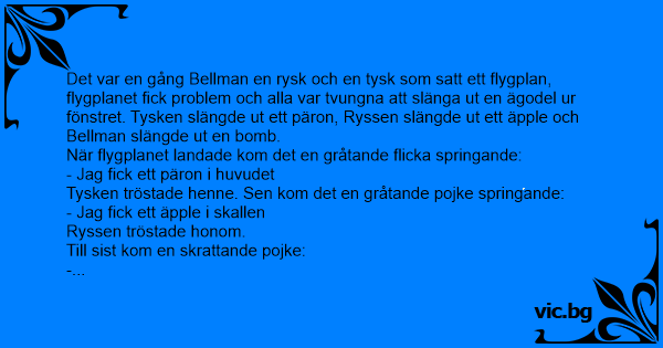 Det var en gång Bellman en rysk och en tysk som satt ett flygplan, flygplanet fiск problem och alla var tvungna att slänga ut en ägodel ur fönstret. Tysken slängde ut ett päron, Ryssen slängde ut ett äpple och Bellman slängde ut en bomb.