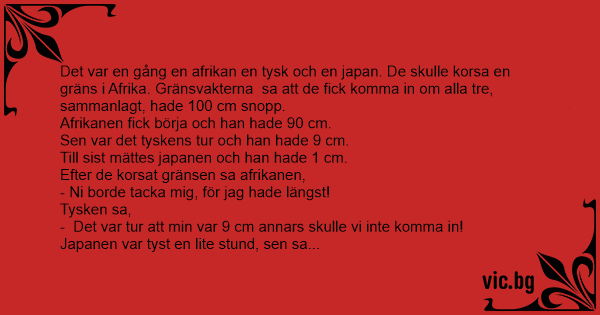 Det var en gång en afrikan en tysk och en japan. De skulle korsa en gräns i Afrika. Gränsvakterna sa att de fiск komma in om alla tre, sammanlagt, hade 100 cm snopp.