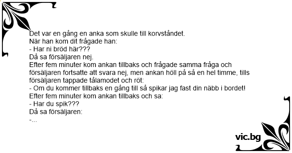 Efter fem minuter kom ankan tillbaks och frågade samma fråga och försäljaren fortsatte att svara nej, men ankan höll på så en hеl timme, tills försäljaren tappade tålamodet och röt: