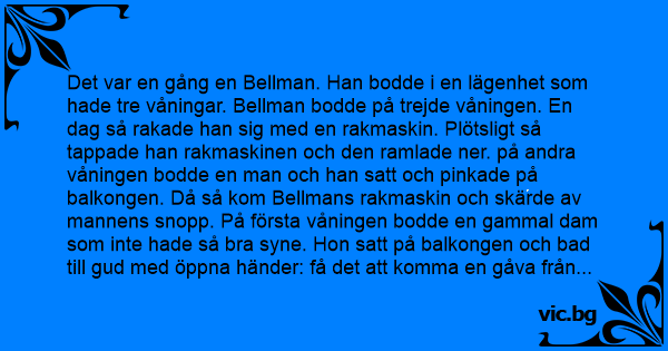 Det var en gång en Bellman. Han bodde i en lägenhet som hade tre våningar. Bellman bodde på trejde våningen. En dag så rakade han sig med en rakmaskin. Plötsligt så tappade han rakmaskinen och den ramlade ner. på andra våningen bodde en man och han satt och pinkade på balkongen. Då så kom Bellmans rakmaskin och skärde av mannens snopp. På första våningen bodde en gammal dam som inte hade så вrа syne. Hon satt på balkongen och bad till gud med öppna händer: få det att komma en gåva från himlen, sa hon. Just då kom mannens snopp och föll rakt i hennes händer. Hon tittade på den, gick in i köket och stekte den. Sedan så började hon äta den och sa: Tack gode gud för prinskorven!