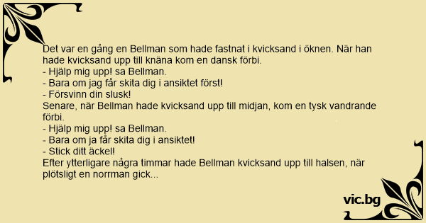 Det var en gång en Bellman som hade fastnat i kvicksand i öknen. När han hade kvicksand upp till knäna kom en dansk förbi.
