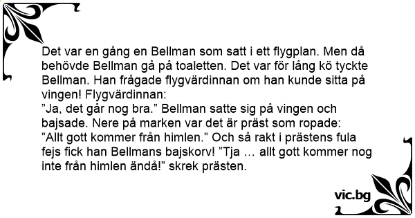 Det var en gång en Bellman som satt i ett flygplan. Men då behövde Bellman gå på toaletten. Det var för lång kö tyckte Bellman. Han frågade flygvärdinnan om han kunde sitta på vingen! Flygvärdinnan: