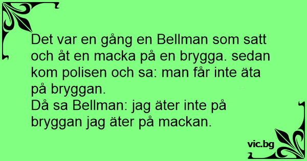Det var en gång en Bellman som satt och åt en macka på en brygga. sedan kom polisen och sa: man får inte äta på bryggan.