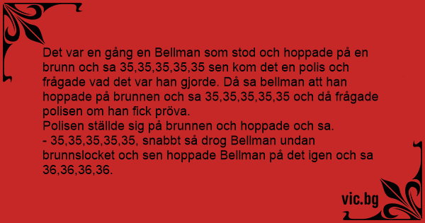 Det var en gång en Bellman som stod och hoppade på en brunn och sa 35,35,35,35,35 sen kom det en polis och frågade vad det var han gjorde. Då sa bellman att han hoppade på brunnen och sa 35,35,35,35,35 och då frågade polisen om han fiск pröva.