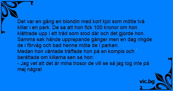 Det var en blondin som kom hem till sin man och sa: - Idag fick jag 20kr av en man om jag klättrade upp i trädet. Mannen: - Är du dum eller? Han ville ju bara se dina trosor. Blondinen: Jaha......