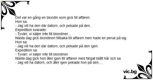 Blondinen går till affären och vill köpa en tv. - Jag vill köpa den där! säger hon och pekar. - Hihi. Vi säljer inte till blondiner. Blondinen blir ledsen och går hem och färgar håret blått. Hon...