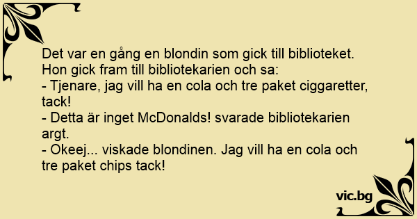 Det var en gång en blondin som gick till biblioteket. Hon gick fram till bibliotekarien och sa: