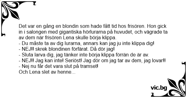 Det var en gång en blondin som kom in hos en frisör. Hon hade ett par hörlurar på huvudet. Hon sade till frisören att han absolut inte fick ta av henne hörlurarna. Frisören klippte och klippte och...