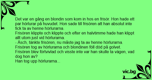 Det var en gång en blondin som hade fått tid hos frisören. Hon gick in i salongen med gigantiska hörlurarna på huvudet, och vägrade ta av dem när frisören Lena skulle börja klippa. - Du måste ta...
