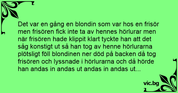 Det var en gång en blondin som var hos en frisör men frisören fiск inte ta av hennes hörlurar men när frisören hade klippit klart tyckte han att det såg konstigt ut så han tog av henne hörlurarna plötsligt föll blondinen ner död på backen då tog frisören och lyssnade i hörlurarna och då hörde han andas in andas ut andas in andas ut...