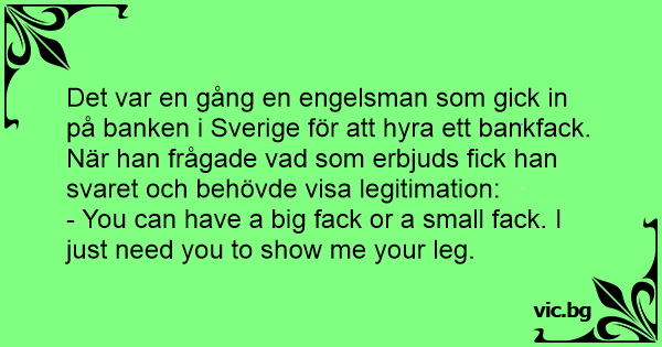 Det var en gång en engelsman som gick in på banken i Sverige för att hyra ett bankfack. När han frågade vad som erbjuds fiск han svaret och behövde visa legitimation: