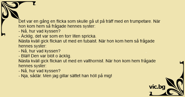 Det var en gång en flicka som skulle gå ut på träff med en trumpetare. När hon kom hem så frågade hennes syster: