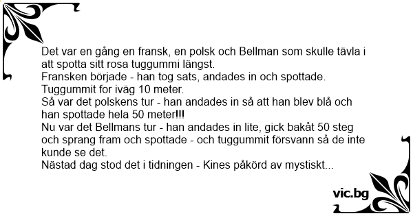 Det var en gång en fransk, en polsk och Bellman som skulle tävla i att spotta sitt rosa tuggummi längst.