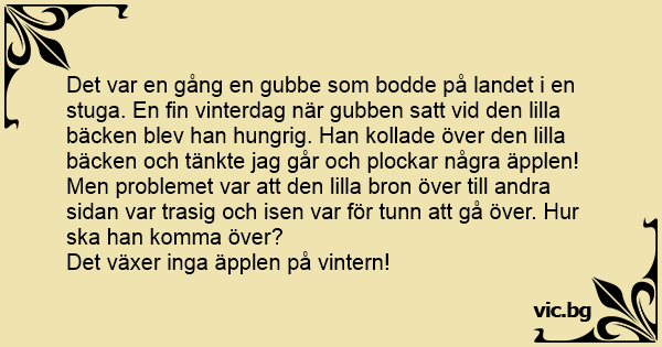 Det var en gång en gubbe som bodde på landet i en stuga. En fin vinterdag när gubben satt vid den lilla bäcken blev han hungrig. Han kollade över den lilla bäcken och tänkte jag går och plockar några äpplen! Men problemet var att den lilla bron över till andra sidan var trasig och isen var för tunn att gå över. Hur ska han komma över?