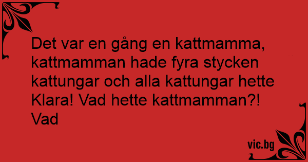 Det var en gång en kattmamma, kattmamman hade fyra stycken kattungar och alla kattungar hette Klara! Vad hette kattmamman?!