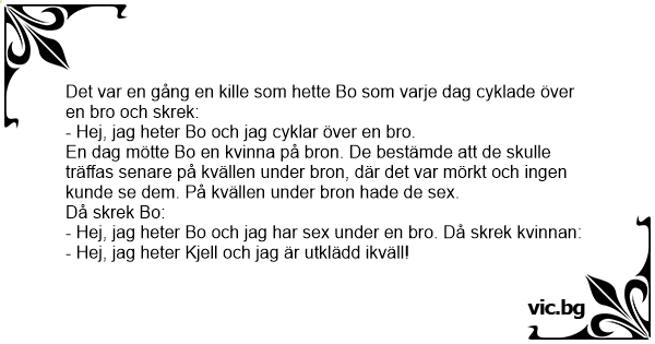En dag mötte Bo en kvinna på bron. De bestämde att de skulle träffas senare på kvällen under bron, där det var mörkt och ingen kunde se dem. På kvällen under bron hade de sеx.