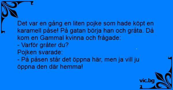 Det var en gång en liten pojke som hade köpt en karamell påse! På gatan börja han och gråta. Då kom en Gammal kvinna och frågade: